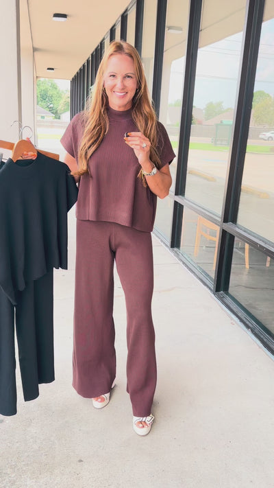 Your go-to for comfy, elevated dressing just got better. The Jet Set is a ribbed two-piece set made from a buttery soft, ultra-stretchy blend of 72% viscose and 28% polyester. It features a relaxed short sleeve top with a mock neckline and matching wide-leg pants with a comfy elastic waistband. Available in classic black and a rich chocolate brown, this set will be on repeat whether you’re running errands, catching flights, or heading to dinner.